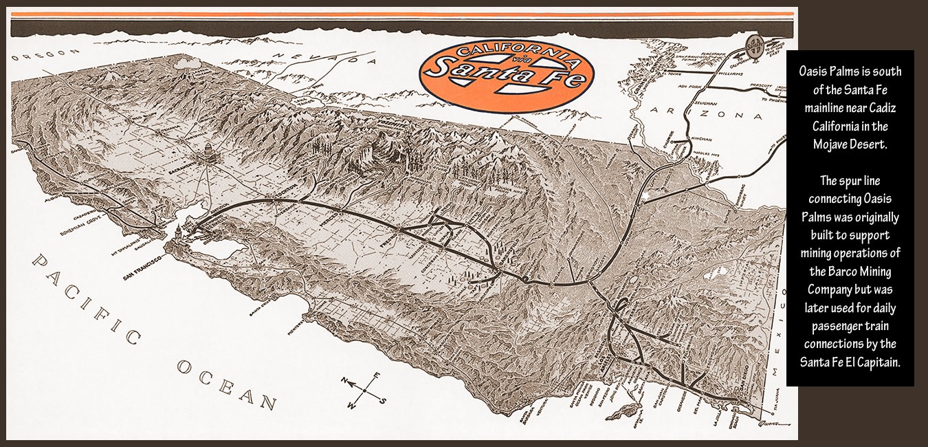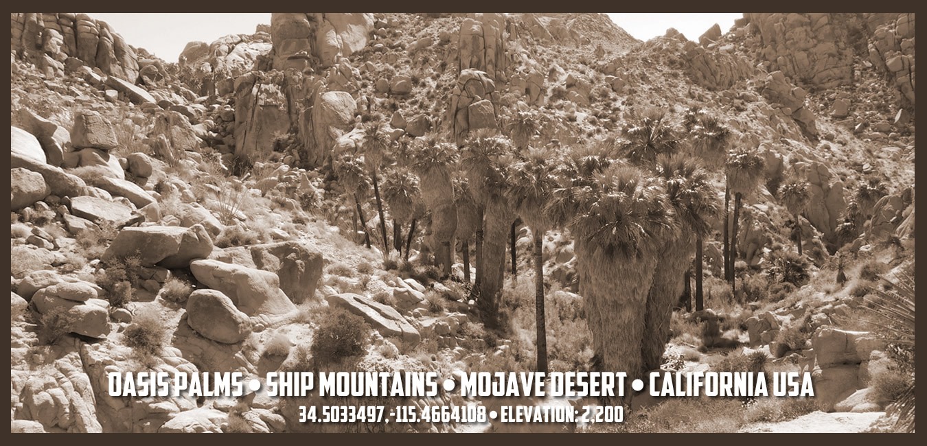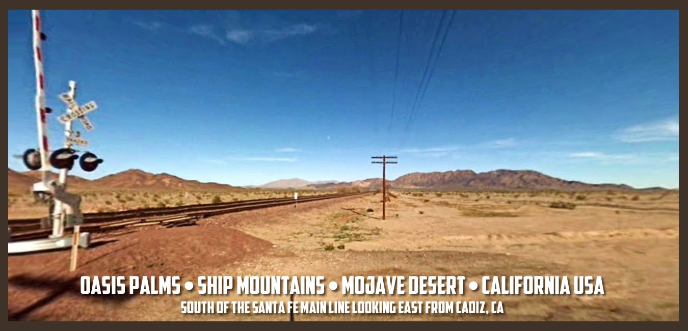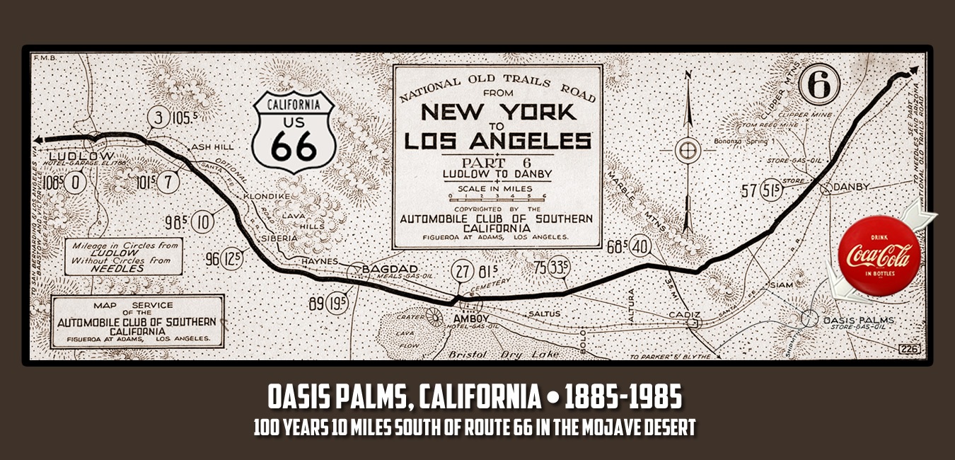 Oasis Palms, was a town located in the heart of California’s Mojave Desert in San Bernardino County nestled in a plateau in the Ship Mountains, just ten miles south of historic Route 66. This desert enclave emerged south of the Santa Fe railroad main line in the late 1800’s, near other long-forgotten Mojave Desert towns and water stops including Amboy, Cadiz, and Danby, all located along the Old National Trails Highway. This desert oasis thrived for a century and then was gone, becoming the “Lost Pearl of the Mojave Desert.”